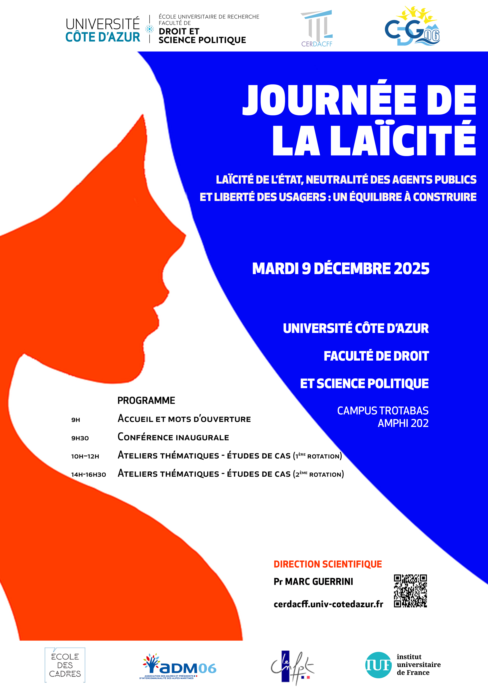Placée sous le thème « Laïcité de l’État, neutralité des agents publics et liberté des usagers : un équilibre à construire », la journée s’ouvrira par une conférence inaugurale, avant de se poursuivre sous la forme d’ateliers d’études de cas réunissant universitaires, magistrats administratifs, cadres de la fonction publique et spécialistes de la gestion des conflits