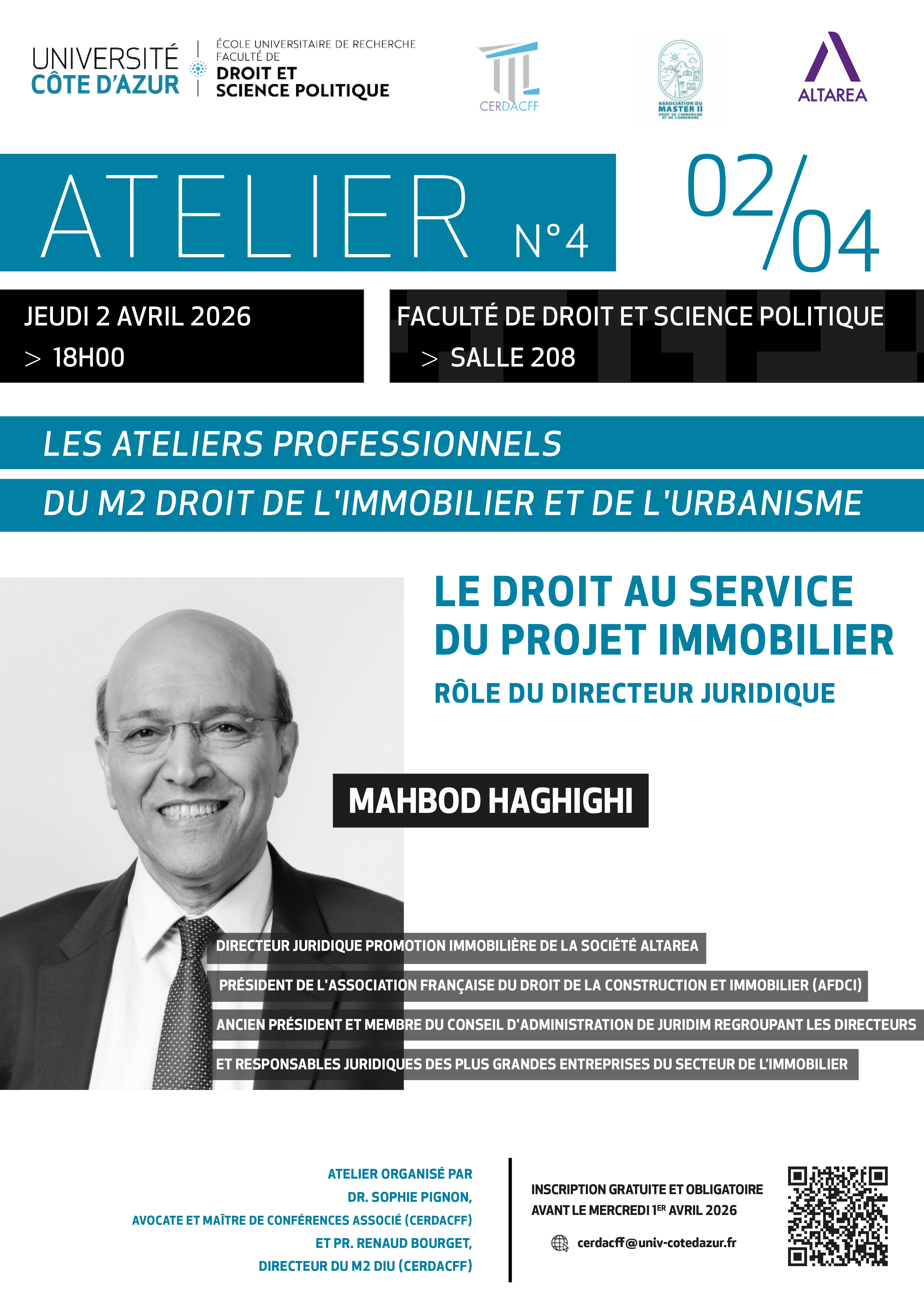 Cet atelier est organisé par le Dr. Sophie Pignon, avocate et maître de conférences associé (CERDACFF) et le Professeur Renaud Bourget, directeur du Master 2 Droit de l'immobilier et de l'urbanisme (CERDACFF).