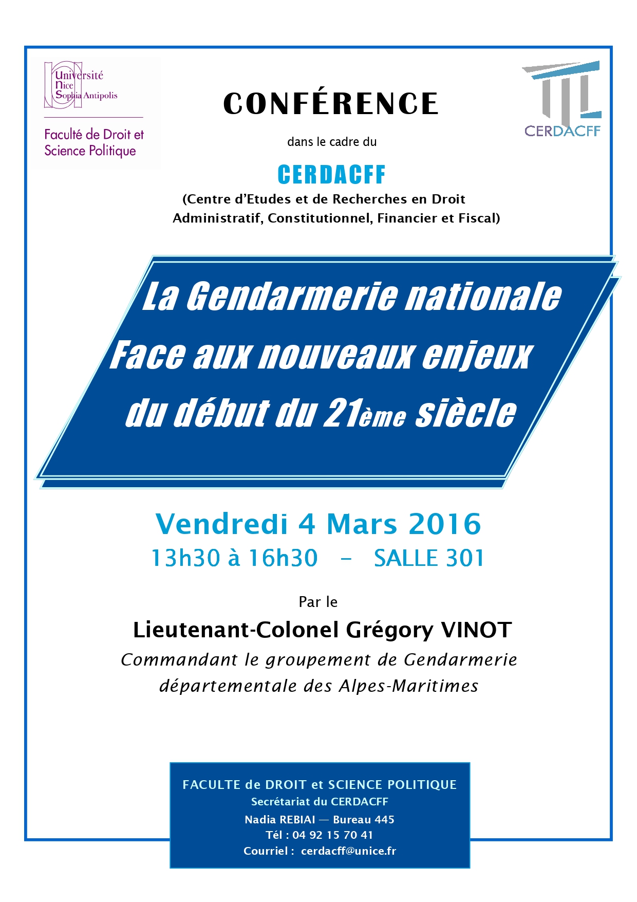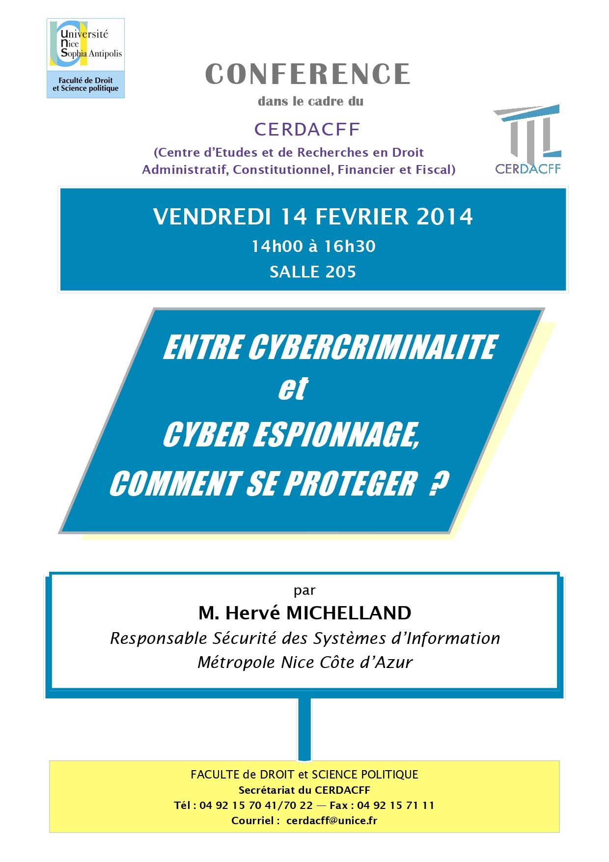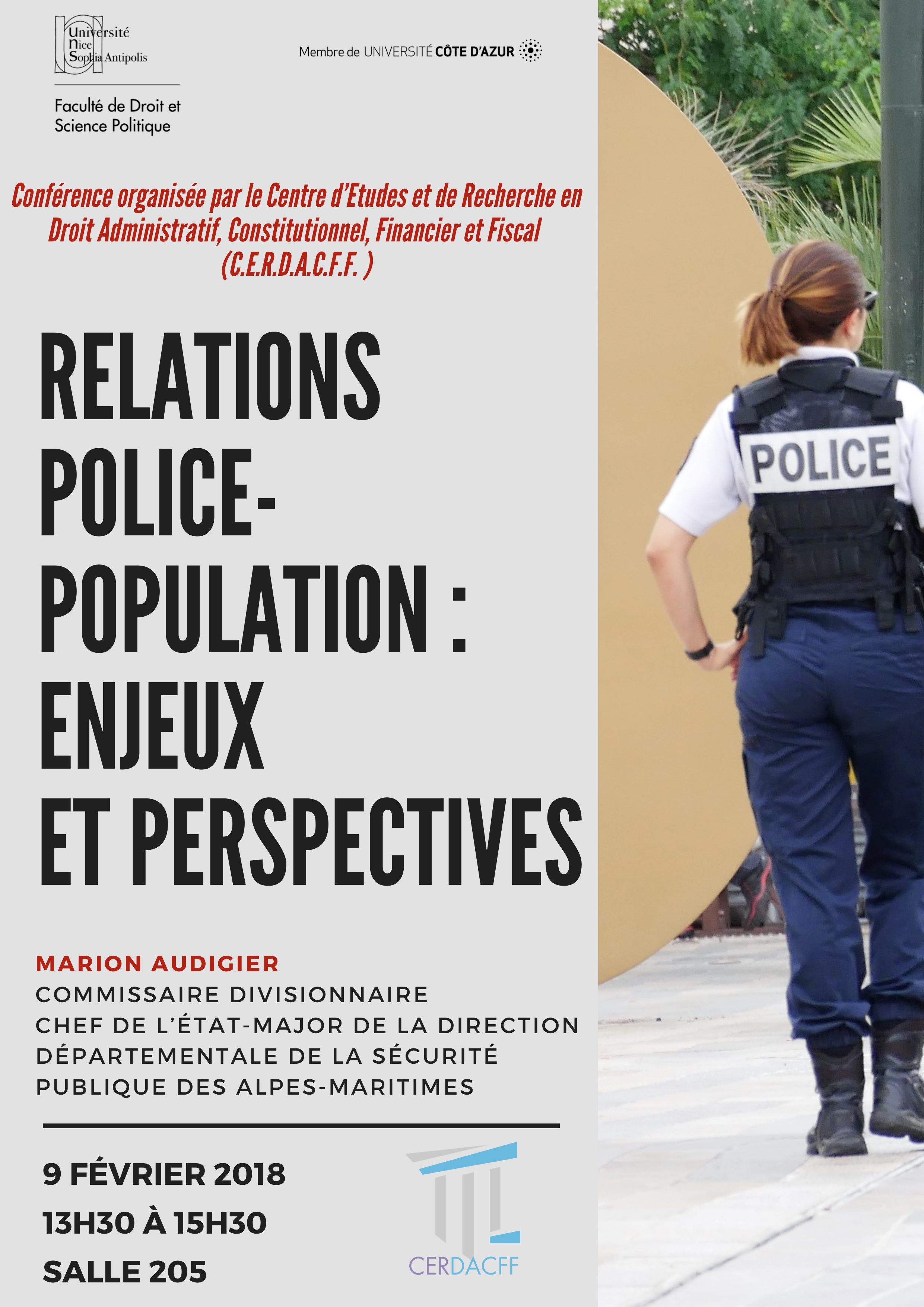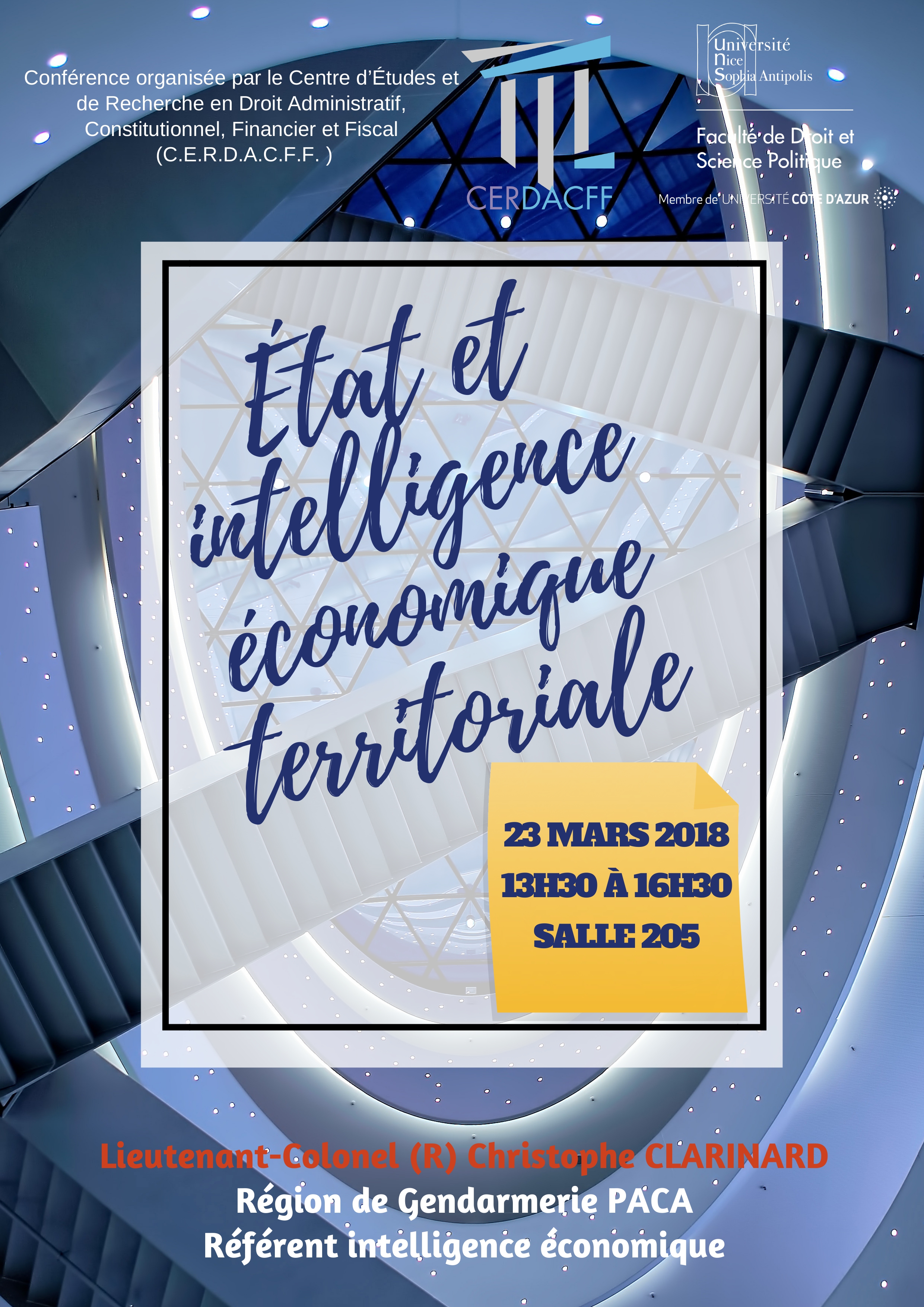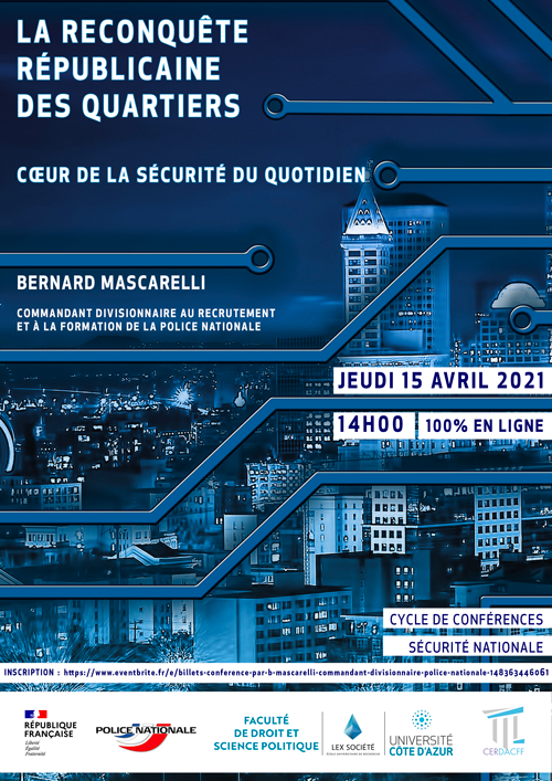 Conférence organisée dans le cadre du Master 2 Sécurité intérieure (présentée par le Professeur Christian Vallar, Florence Nicoud, maître de conférences HDR et Riadh Jaidane, avocat au Barreau de Nice et chercheur associé au CERDACFF )