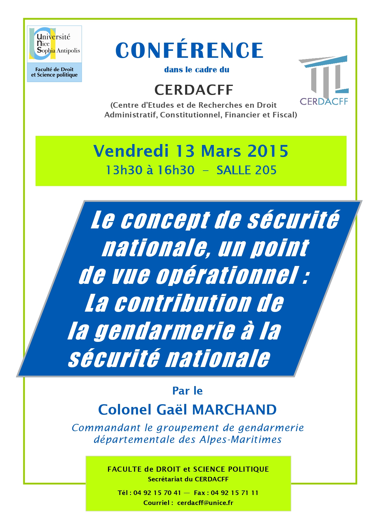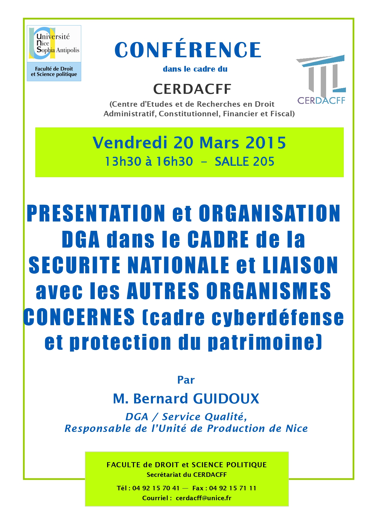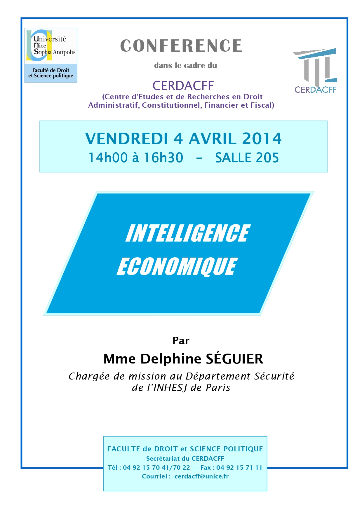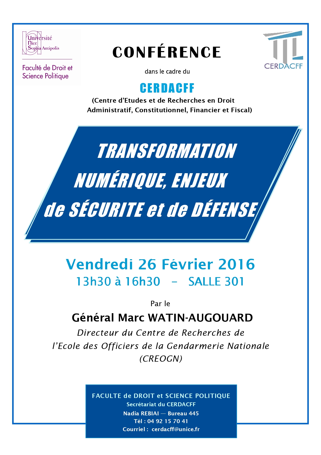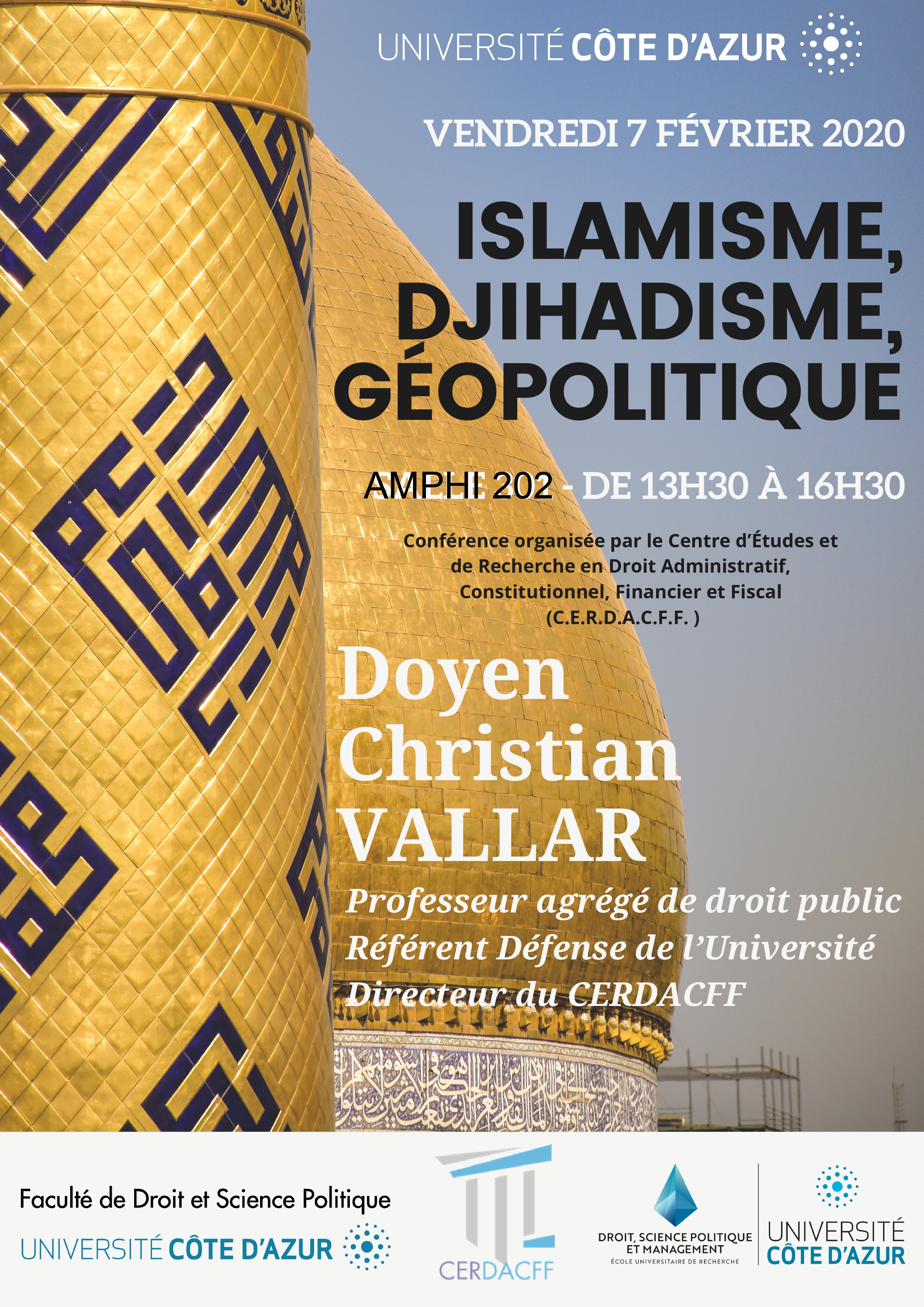Conférence organisée dans le cadre du Master 2 Sécurité intérieure (présentée par le Professeur Christian Vallar, Florence Nicoud, maître de conférences HDR et Riadh Jaidane, avocat au Barreau de Nice et chercheur associé au CERDACFF )