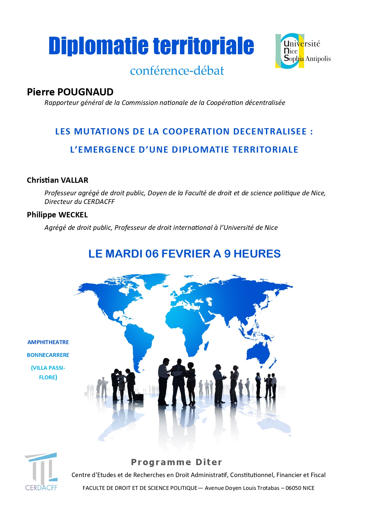 Discutants : Professeur Florence Crouzatier-Durand, Marie Odile Diemer, Maître de conférences, Bertrand Gasiglia, Conseiller du Président du Département des Alpes-Maritimes, Maire de Tourrette-Levens, chercheur associé au CERDACFF.