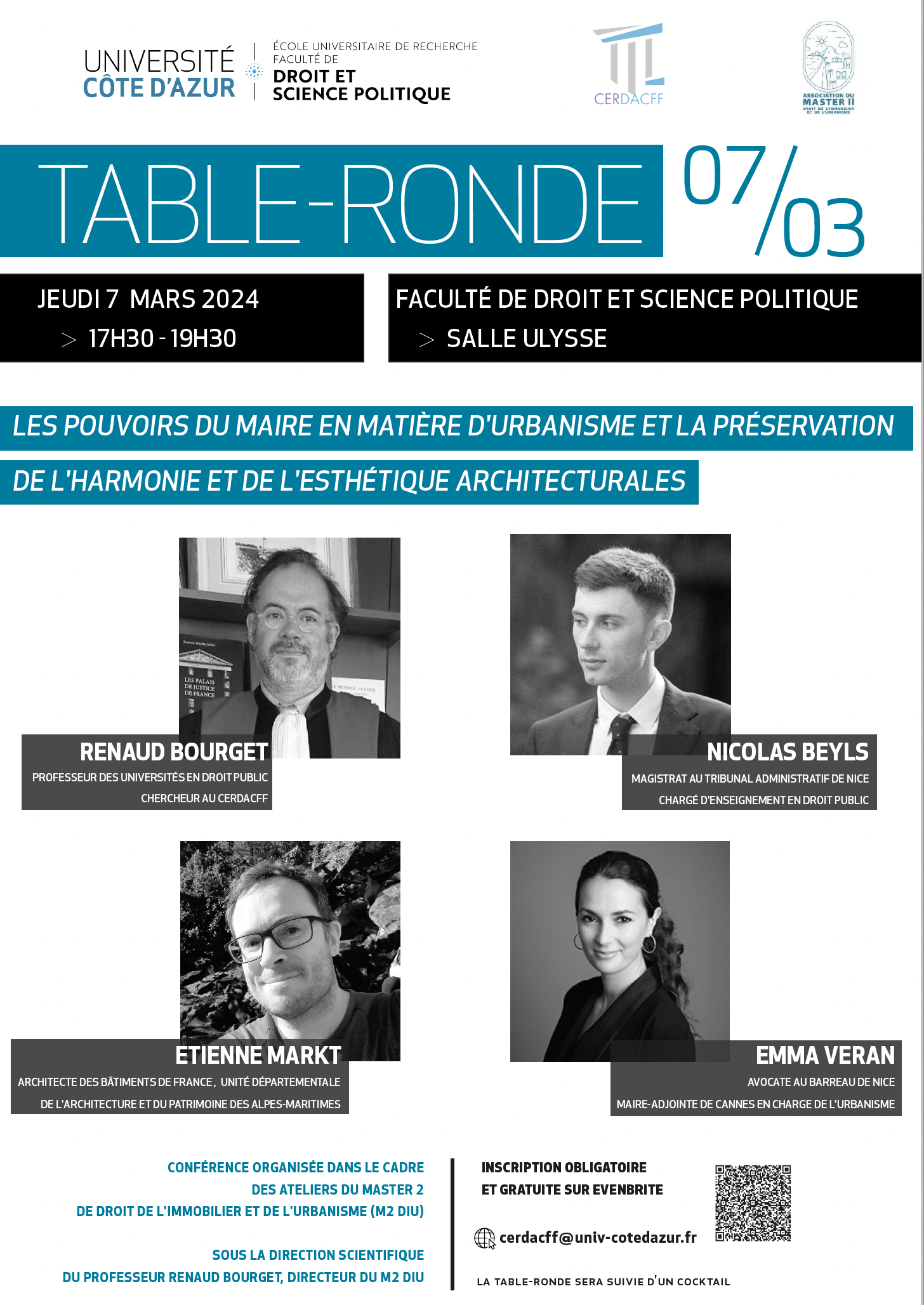 Renaud Bourget, professeur des Universités en droit public, Nicolas Beyls, Magistrat au Tribunal administratif de Nice, Chargé d'enseignement en droit public, Étienne Markt, Architecte des Bâtiments de France, Unité départementale de l'architecture et du patrimoine des Alpes-Maritimes, Emma Veran, Avocate au Barreau de Nice, Maire-adjointe de Cannes en charges de l'urbanisme