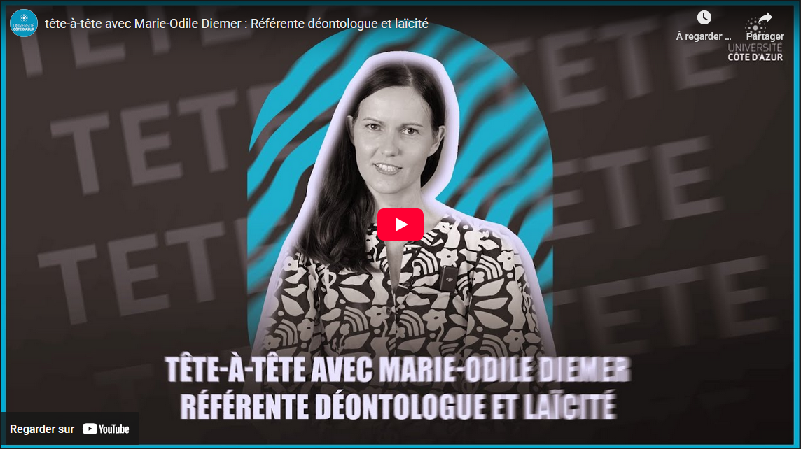 Découvrez le portrait video de Marie-Odile Diemer, Maître de conférences HDR en droit public à l'Université Côte d'Azur, chercheur au CERDACFF, co-directrice du DU Médiation, responsable de la Capacité en droit et référente déontologue et laïcité d'Université Côte d'Azur.