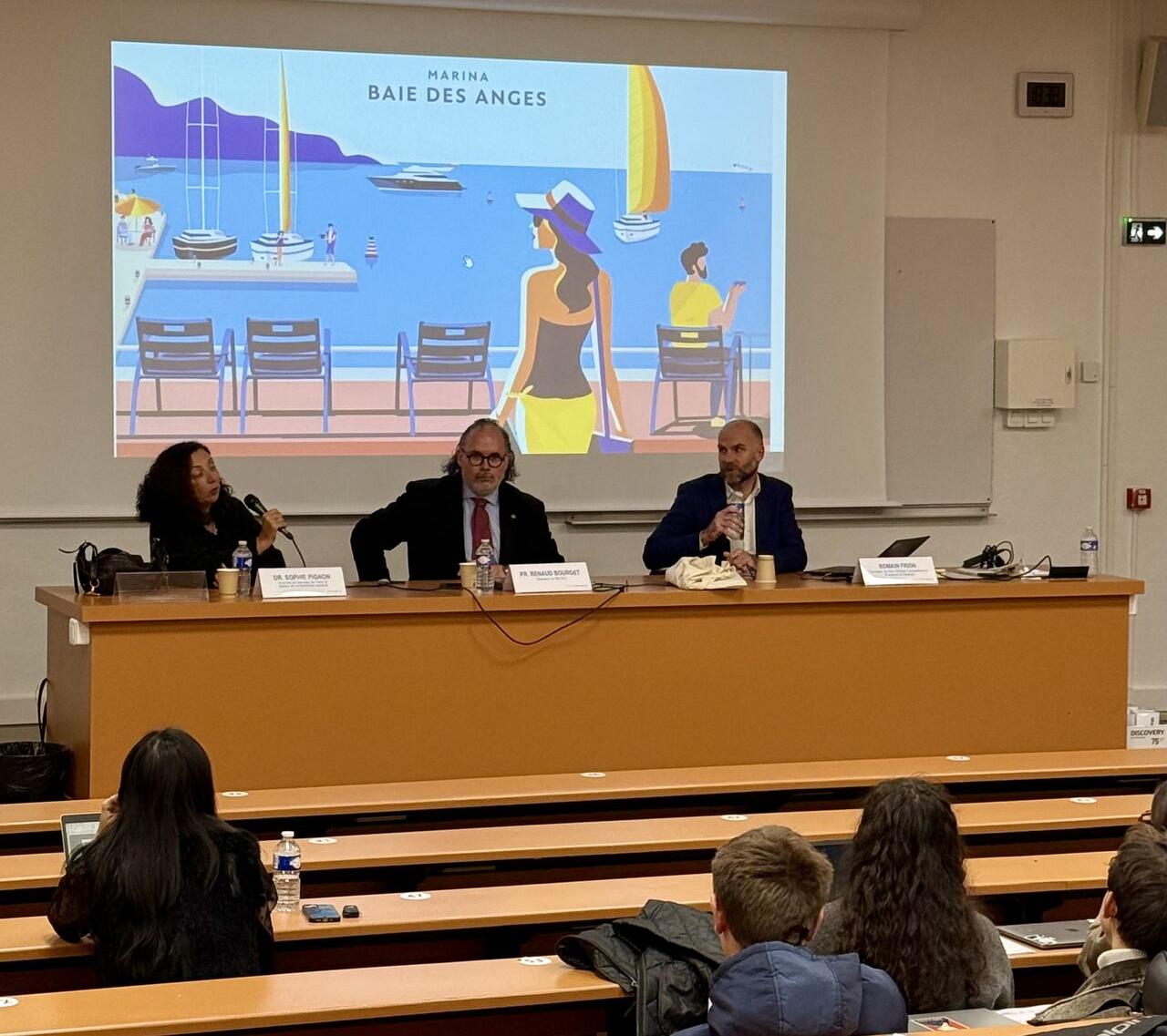 Romain Frion a présenté aux étudiants et aux doctorants les aspects juridiques et financiers de ce projet structuré sous forme de partenariat avec la Commune de Villeneuve-Loubet. Cette dernière a confié au groupe Eiffage l'exploitation du port pour une durée de 30 ans. Le projet concerne un port de 515 anneaux et représente un investissement portuaire de 70 millions d'euros HT.