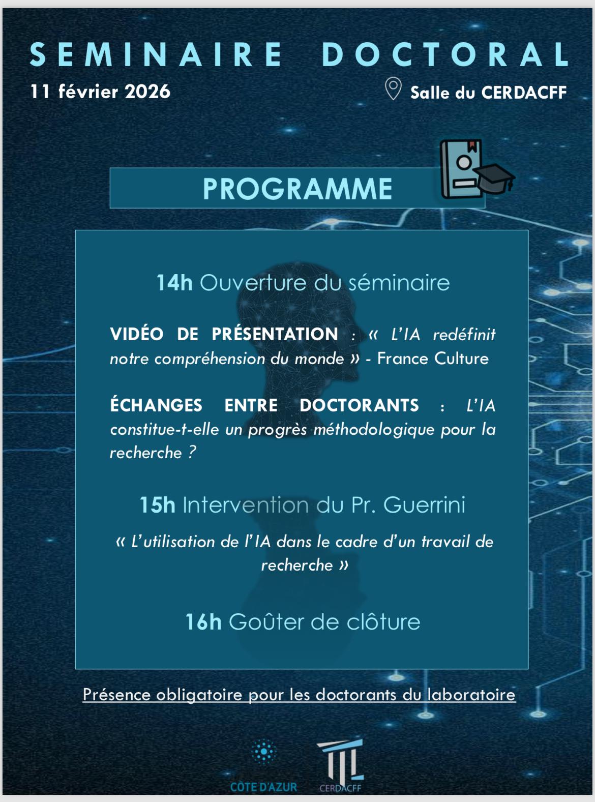 Présence obligatoire pour les doctorants du laboratoire. Doctorants : Participation validée au titre de la formation doctorale. Attestation délivrée sur demande adressée à : cerdacff@univ-cotedazur.fr.